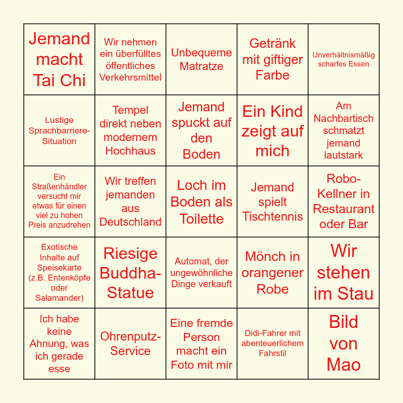 This bingo card has 25 words: Riesige Buddha-Statue, Eine fremde Person macht ein Foto mit mir, Jemand spuckt auf den Boden, Ich habe keine Ahnung, was ich gerade esse, Unverhältnismäßig scharfes Essen, Jemand macht Tai Chi, Lustige Sprachbarriere-Situation, Wir nehmen ein überfülltes öffentliches Verkehrsmittel, Jemand spielt Tischtennis, Automat, der ungewöhnliche Dinge verkauft, Ein Kind zeigt auf mich, Ein Straßenhändler versucht mir etwas für einen viel zu hohen Preis anzudrehen, Mönch in orangener Robe, Wir stehen im Stau, Tempel direkt neben modernem Hochhaus, Bild von Mao, Robo-Kellner in Restaurant oder Bar, Unbequeme Matratze, Am Nachbartisch schmatzt jemand lautstark, Wir treffen jemanden aus Deutschland, Loch im Boden als Toilette, Ohrenputz-Service, Exotische Inhalte auf Speisekarte (z.B. Entenköpfe oder Salamander), Getränk mit giftiger Farbe and Didi-Fahrer mit abenteuerlichem Fahrstil.