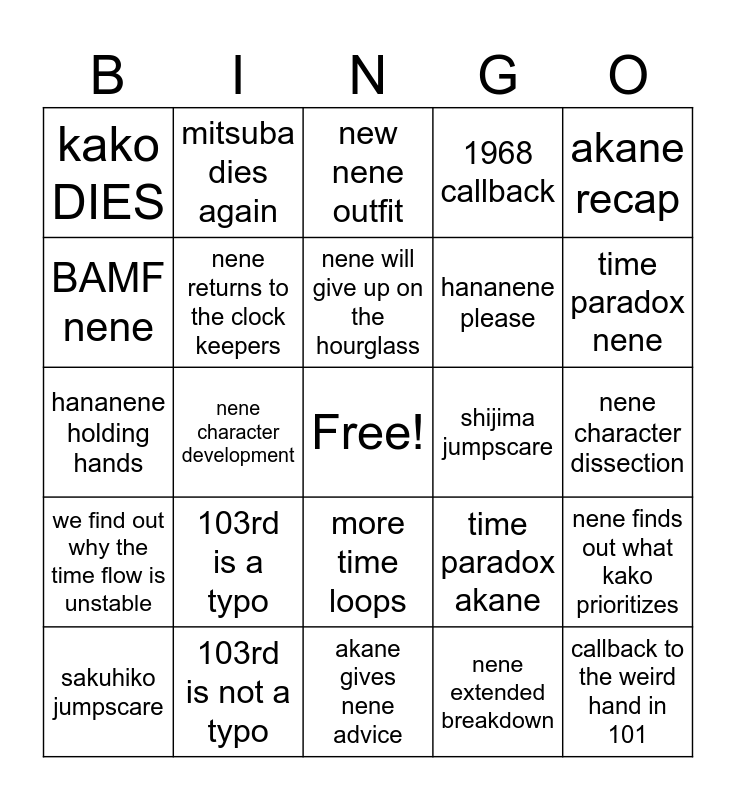 This bingo card has a free space and 24 words: 103rd is a typo, 103rd is not a typo, nene will give up on the hourglass, sakuhiko jumpscare, akane recap, kako DIES, BAMF nene, mitsuba dies again, shijima jumpscare, more time loops, hananene please, hananene holding hands, time paradox akane, nene finds out what kako prioritizes, nene returns to the clock keepers, nene extended breakdown, nene character dissection, new nene outfit, time paradox nene, nene character development, callback to the weird hand in 101, we find out why the time flow is unstable, 1968 callback and akane gives nene advice.