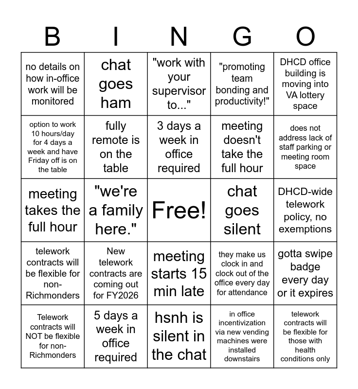This bingo card has a free space and 24 words: New telework contracts are coming out for FY2026, 5 days a week in office required, 3 days a week in office required, Telework contracts will NOT be flexible for non-Richmonders, DHCD office building is moving into VA lottery space, no details on how in-office work will be monitored, option to work 10 hours/day for 4 days a week and have Friday off is on the table, chat goes ham, chat goes silent, meeting starts 15 min late, meeting doesn't take the full hour, meeting takes the full hour, they make us clock in and clock out of the office every day for attendance, gotta swipe badge every day or it expires, fully remote is on the table, in office incentivization via new vending machines were installed downstairs, DHCD-wide telework policy, no exemptions, "work with your supervisor to...", does not address lack of staff parking or meeting room space, "we're a family here.", telework contracts will be flexible for those with health conditions only, telework contracts will be flexible for non-Richmonders, "promoting team bonding and productivity!" and hsnh is silent in the chat.