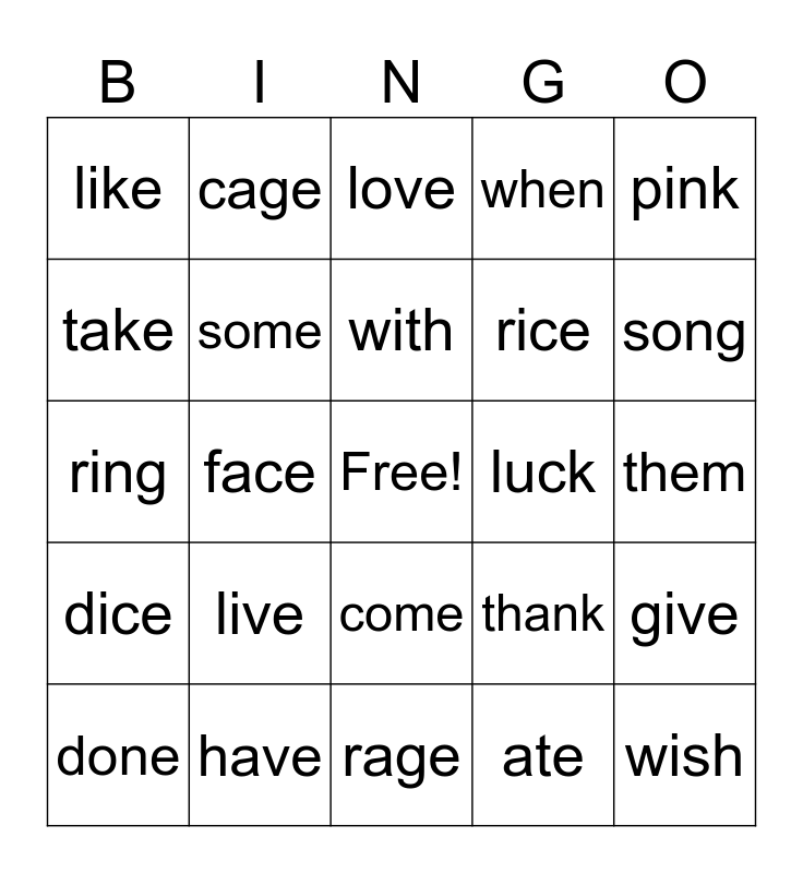 This bingo card has a free space and 24 words: live, have, with, done, pink, like, take, cage, luck, come, rice, ring, thank, give, some, ate, them, love, song, face, wish, dice, when and rage.