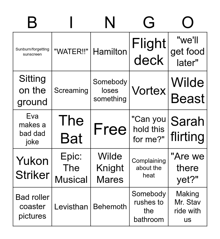 This bingo card has a free space and 24 words: Bad roller coaster pictures, Epic: The Musical, Somebody loses something, Somebody rushes to the bathroom, "we'll get food later", Sunburn/forgetting sunscreen, "WATER!!", Hamilton, "Can you hold this for me?", Sarah flirting, Eva makes a bad dad joke, Screaming, Complaining about the heat, "Are we there yet?", Sitting on the ground, Levisthan, Behemoth, Flight deck, Wilde Beast, Yukon Striker, The Bat, Wilde Knight Mares, Vortex and Making Mr. Stav ride with us.