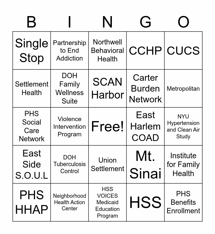 This bingo card has a free space and 29 words: PHS HHAP, DOH Public Health Clinics, Violence Intervention Program, NYCHA Health Initiatives, Single Stop, Northwell Behavioral Health, DOH Family Wellness Suite, DOH Tuberculosis Control, East Harlem COAD, Neighborhood Health Action Center, NYU Hypertension and Clean Air Study, PHS Benefits Enrollment, HSS VOICES Medicaid Education Program, HSS, Metropolitan, MSK, Union Settlement, East Side S.O.U.L, CUCS, PHS Social Care Network, Mt. Sinai, Boriken, Carter Burden Network, Settlement Health, CCHP, Partnership to End Addiction, Institute for Family Health, SCAN Harbor and Isaacs Center/ Goddard Riverside.