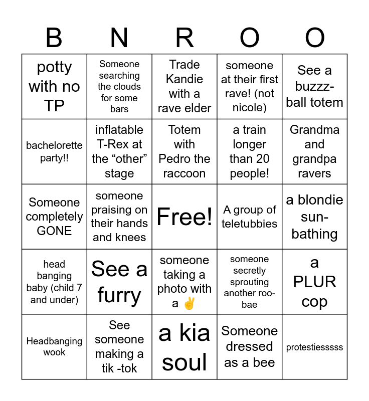 This bingo card has a free space and 24 words: See a furry, See someone making a tik -tok, Totem with Pedro the raccoon, Headbanging wook, See a buzzz-ball totem, potty with no TP, bachelorette party!!, Someone searching the clouds for some bars, A group of teletubbies, someone taking a photo with a ✌️, a train longer than 20 people!, Someone completely GONE, someone secretly sprouting another roo-bae, a PLUR cop, inflatable T-Rex at the “other” stage, Someone dressed as a bee, a blondie sun-bathing, Trade Kandie with a rave elder, Grandma and grandpa ravers, someone praising on their hands and knees, protestiesssss, head banging baby (child 7 and under), someone at their first rave! (not nicole) and a kia soul.