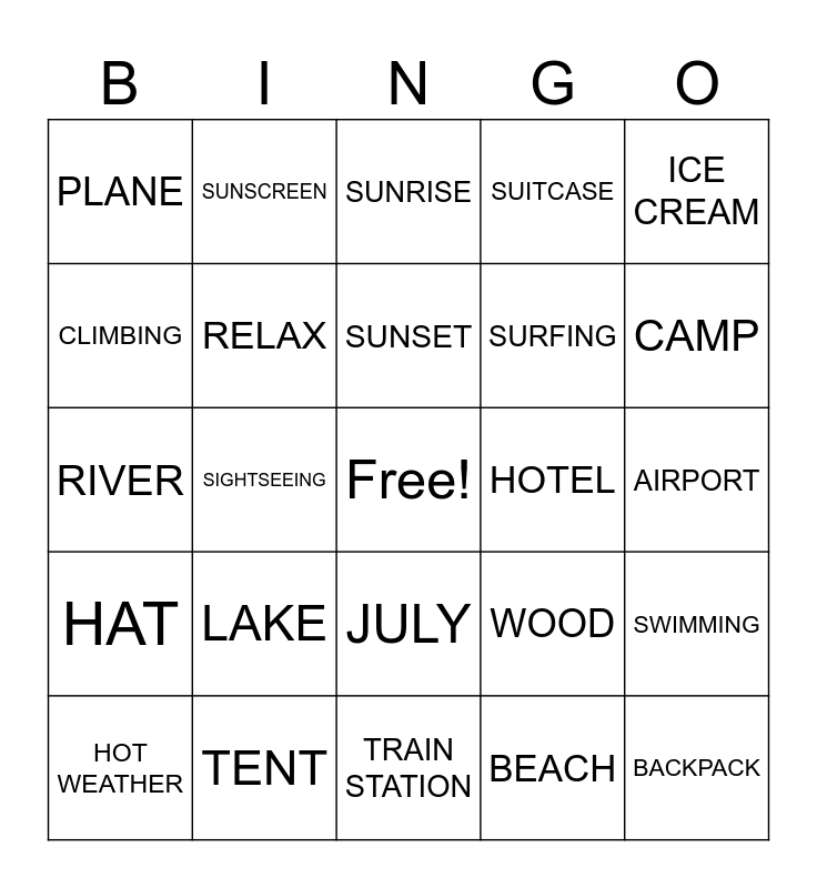 This bingo card has a free space and 34 words: SUMMER, BEACH, SUNGLASSES, SANDCASTLE, HAT, RELAX, ICE CREAM, HOT WEATHER, SUNSCREEN, TOWEL, SUNSET, SUNRISE, MOUNTAIN, JOURNEY, HOTEL, CAMP, TENT, RIVER, LAKE, WOOD, JULY, AUGUST, PLANE, AIRPORT, TRAIN STATION, BACKPACK, SUITCASE, SWIMSUIT, SURFING, CLIMBING, TOURIST, SIGHTSEEING, SWIMMING and CYCLING.