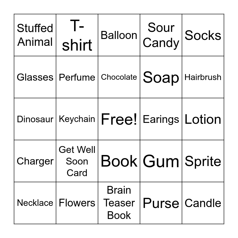This bingo card has a free space and 24 words: Get Well Soon Card, Flowers, Chocolate, Necklace, Socks, Stuffed Animal, Glasses, T-shirt, Earings, Book, Soap, Dinosaur, Gum, Sprite, Perfume, Purse, Lotion, Balloon, Hairbrush, Keychain, Candle, Charger, Sour Candy and Brain Teaser Book.