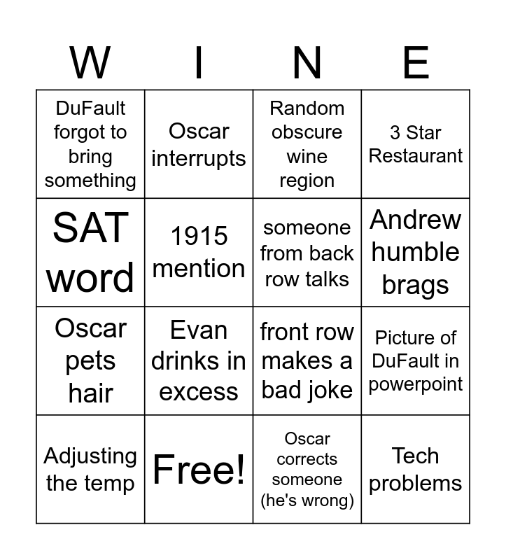 This bingo card has 24 words: "Jancis Robinson", Oscar looks for validation, Andrew humble brags, Front row active listens too hard, SAT word, DuFault forgot to bring something, 1915 mention, Oscar interrupts, Free!, Dufault Gentle parents, Oscar pets hair, front row makes a bad joke, Tony monologues, Oscar makes something up, someone from back row talks, Oscar laughs, Oscar corrects someone (he's wrong), Random obscure wine region, Evan drinks in excess, Picture of DuFault in powerpoint, Adjusting the temp, Tech problems, 3 Star Restaurant and Tony was at a country club.