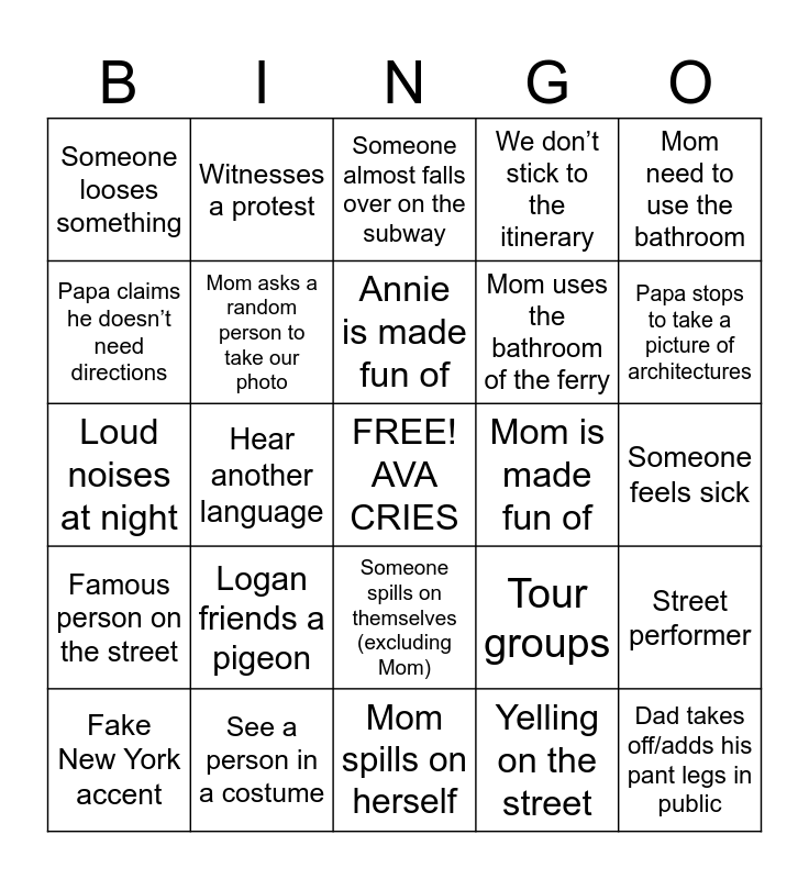 This bingo card has a free space and 62 words: Bag gets pulled at the Airport, See a person in a costume, See an animal (not a pigeon, pet, or ordinary animal), Famous person on the street, Ava gets lost, Ava won’t stop doing the thing you asked her not to do, Mom asks a random person to take our photo, Someone takes a picture of food, Mom uses the bathroom of the ferry, Annie is late, We don’t stick to the itinerary, Siblings start fighting, Papa claims he doesn’t need directions, Annie says darn shmarn, Logan makes a “joke”, Someone looses something, Dad takes off/adds his pant legs in public, Mom need to use the bathroom, The itinerary is referenced, Annie is made fun of, Mom is made fun of, Someone almost falls over on the subway, Fake New York accent, Yelling on the street, Hear another accent, Transportation is delayed (plane, car, subway), Get soaked by the rain, Wrong directions, Street performer, Subway performer, Annie doesn’t like the food we choose, Ava complains about walking, Someone gets hurt, Annie trips, Someone feels sick, Witnesses a protest, Papa googles something at dinner, Logan gets annoyed, Hear another language, The smell of weed, Loud noises at night, Logan looks up tourist sites on wikipedia, Logan friends a pigeon, Papa mentions architecture, Papa stops to take a picture of architectures, Tour groups, Papa forget selfie stick in hotel, Ava wants to buy something, Girls ask for a sweet treat, Someone gets a stomach ache from hotel breakfast, Someone spills on themselves (excluding Mom), Mom spills on herself, The itinerary is edited, Timing is messed up, Ava drops her phone, Cleaners don’t come, Papa trips, Mom trips, Ava trips, Logan trips, Someone complains about the smell and Annie asks for a snack.