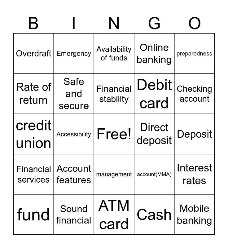 This bingo card has a free space and 41 words: bank, credit union, Federal Reserve System, Safe and secure, Sound financial, management, Financial stability, Emergency financial, preparedness, Financial services, Accessibility, Online banking, Mobile banking, Deposit, Direct deposit, Account features, Account fees, Overdraft, Overdraft protection, Availability of funds, Interest rates, Interest, ATM card, Debit card, Location, Liquidity, Cash, Account, Checking account, Check, Savings account, Emergency, fund, money market account (MMA), account(MMA), Rate of return, Certificate of deposit (CD), FDIC/NCUA, Minimum, balance and Withdrawal.