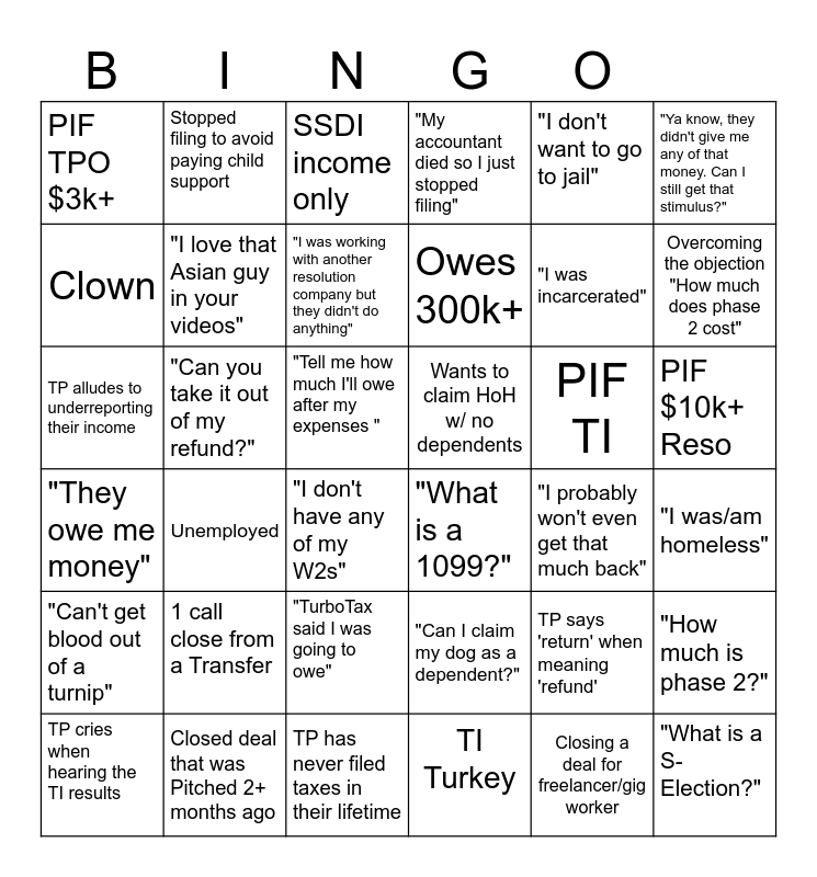 This bingo card has 36 words: "They owe me money", Unemployed, TP has never filed taxes in their lifetime, Owes 300k+, PIF TI, PIF $10k+ Reso, PIF TPO $3k+, Closed deal that was Pitched 2+ months ago, SSDI income only, "Can I claim my dog as a dependent?", "I was incarcerated", "Ya know, they didn't give me any of that money. Can I still get that stimulus?", "Can't get blood out of a turnip", "Can you take it out of my refund?", "I was working with another resolution company but they didn't do anything", "My accountant died so I just stopped filing", TP says 'return' when meaning 'refund', "I was/am homeless", Clown, "I love that Asian guy in your videos", "I don't have any of my W2s", "What is a 1099?", "I probably won't even get that much back", "How much is phase 2?", TP alludes to underreporting their income, Stopped filing to avoid paying child support, "Tell me how much I'll owe after my expenses ", TI Turkey, "I don't want to go to jail", Overcoming the objection "How much does phase 2 cost", TP cries when hearing the TI results, 1 call close from a Transfer, "TurboTax said I was going to owe", Wants to claim HoH w/ no dependents, Closing a deal for freelancer/gig worker and "What is a S-Election?".