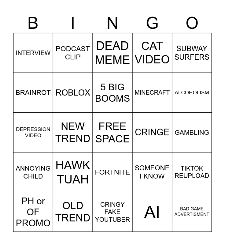 This bingo card has a free space and 24 words: HAWK TUAH, OLD TREND, 5 BIG BOOMS, PH or OF PROMO, SUBWAY SURFERS, INTERVIEW, BRAINROT, PODCAST CLIP, CRINGE, FORTNITE, MINECRAFT, DEPRESSION VIDEO, SOMEONE I KNOW, TIKTOK REUPLOAD, ROBLOX, AI, GAMBLING, DEAD MEME, ALCOHOLISM, NEW TREND, BAD GAME ADVERTISMENT, ANNOYING CHILD, CAT VIDEO and CRINGY FAKE YOUTUBER.