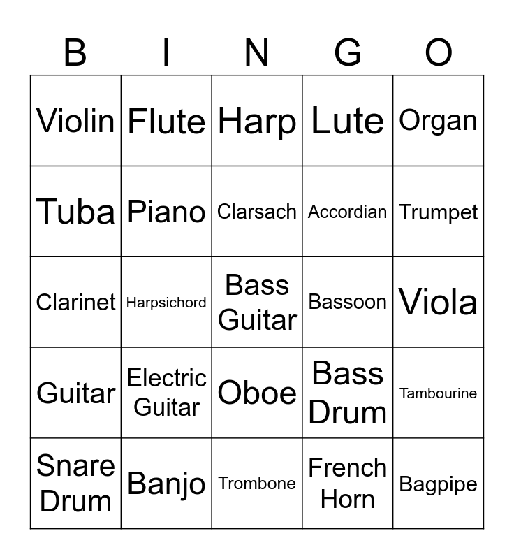 This bingo card has 40 words: Castanets, Clarinet, Ukulele, Piano, Banjo, Oboe, Clarsach, Timpani, Organ, Guitar, Harpsichord, Lute, Bass Guitar, Viola, Bassoon, Electric Guitar, Wood Block, Violin, Xylophone, Harp, Tambourine, French Horn, Accordian, Tuba, Cello, Double Bass, Bongo Drums, Harp, Bagpipe, Triangle, Glockenspiel, Snare Drum, Cymbals, Bass Drum, Trumpet, Trombone, Piccolo, Saxophone, Flute and Bodhran.