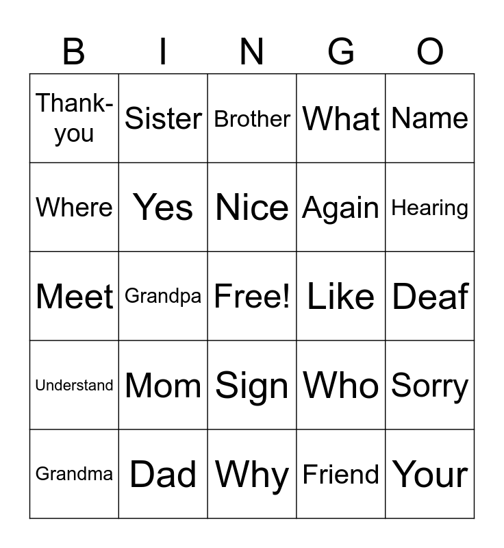 This bingo card has a free space and 24 words: Mom, Dad, Nice, Grandma, Name, Thank-you, Where, Sister, Like, Sign, Again, Meet, Who, Sorry, Yes, Friend, Deaf, Brother, Hearing, Grandpa, Your, Understand, What and Why.