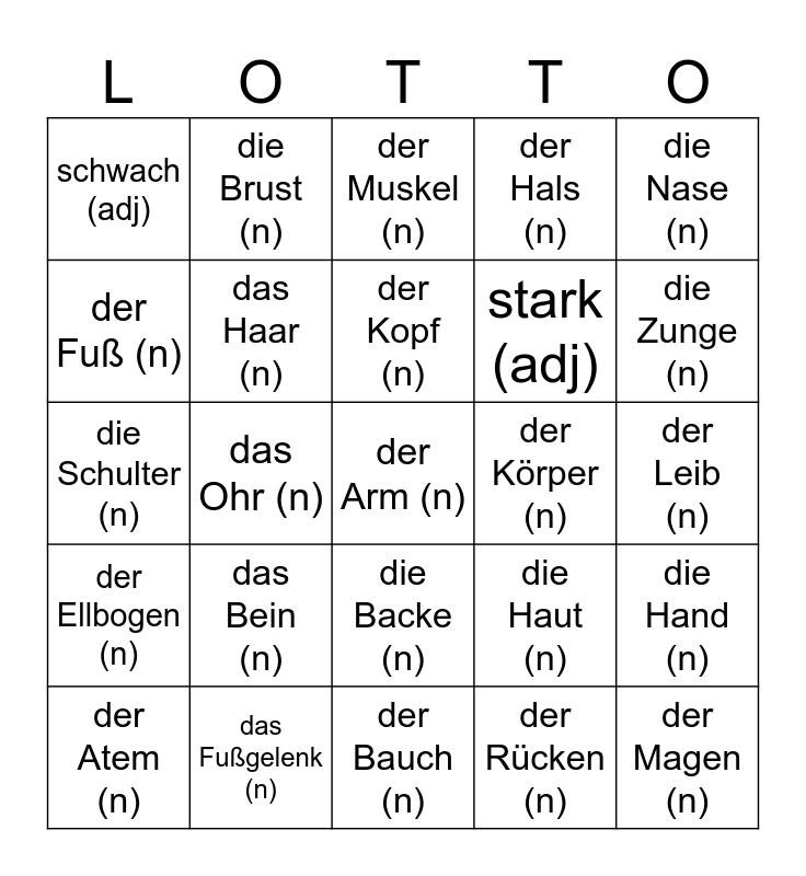 This bingo card has 48 words: Free!, der Arm (n), das Auge (n), der Bauch (n), das Bein (n), das Blut (n), die Brust (n), der Finger (n), der Fuß (n), das Gesicht (n), das Haar (n), der Hals (n), die Hand (n), die Haut (n), das Herz (n), das Knie (n), der Kopf (n), der Körper (n), der Mund (n), die Nase (n), das Ohr (n), der Rücken (n), schwach (adj), stark (adj), der Zahn (n), die Zunge (n), der Atem (n), atmen (v), die Backe (n), der Ellbogen (n), die Faust (n), das Gehirn (n), das Gelenk (n), das Handgelenk (n), das Fußgelenk (n), das Kinn (n), der Knochen (n), der Leib (n), das Lid / Augenlid (n), die Lippe (n), die Lunge (n), der Magen (n), der Muskel (n), der Nerv (n), die Schulter (n), der Schweiß (n), die Stirn (n) and der Zeh (n).
