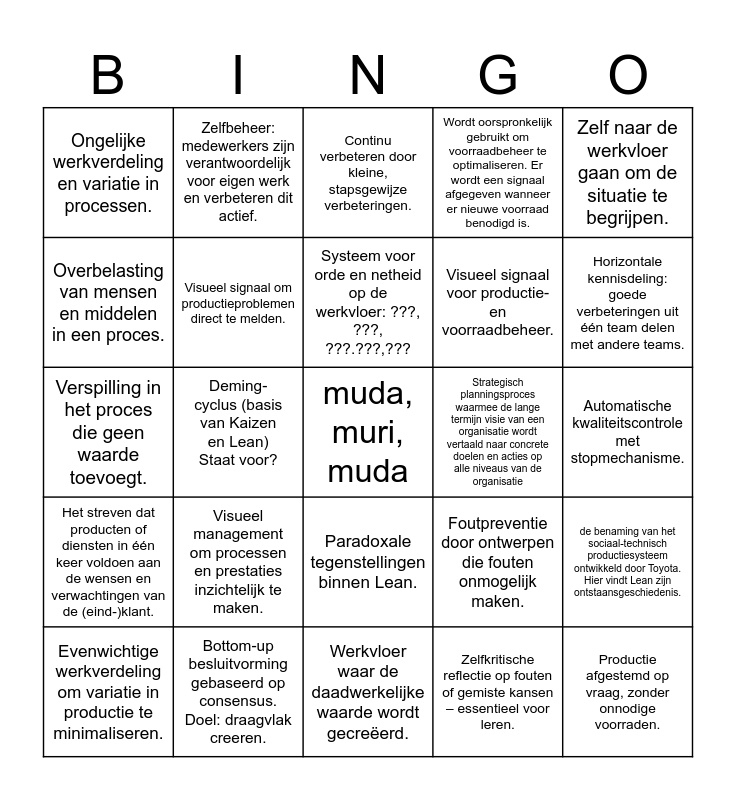 This bingo card has 25 words: Visueel management om processen en prestaties inzichtelijk te maken., Werkvloer waar de daadwerkelijke waarde wordt gecreëerd., Systeem voor orde en netheid op de werkvloer: ???, ???, ???.???,???, Evenwichtige werkverdeling om variatie in productie te minimaliseren., Zelf naar de werkvloer gaan om de situatie te begrijpen., Ongelijke werkverdeling en variatie in processen., Overbelasting van mensen en middelen in een proces., Zelfbeheer: medewerkers zijn verantwoordelijk voor eigen werk en verbeteren dit actief., Strategisch planningsproces waarmee de lange termijn visie van een organisatie wordt vertaald naar concrete doelen en acties op alle niveaus van de organisatie, Paradoxale tegenstellingen binnen Lean., Visueel signaal voor productie- en voorraadbeheer., Verspilling in het proces die geen waarde toevoegt., Foutpreventie door ontwerpen die fouten onmogelijk maken., de benaming van het sociaal-technisch productiesysteem ontwikkeld door Toyota. Hier vindt Lean zijn ontstaansgeschiedenis., Visueel signaal om productieproblemen direct te melden., Productie afgestemd op vraag, zonder onnodige voorraden., Automatische kwaliteitscontrole met stopmechanisme., Continu verbeteren door kleine, stapsgewijze verbeteringen., Horizontale kennisdeling: goede verbeteringen uit één team delen met andere teams., Deming-cyclus (basis van Kaizen en Lean) Staat voor?, muda, muri, muda, Bottom-up besluitvorming gebaseerd op consensus. Doel: draagvlak creeren., Het streven dat producten of diensten in één keer voldoen aan de wensen en verwachtingen van de (eind-)klant., Wordt oorspronkelijk gebruikt om voorraadbeheer te optimaliseren. Er wordt een signaal afgegeven wanneer er nieuwe voorraad benodigd is. and Zelfkritische reflectie op fouten of gemiste kansen – essentieel voor leren..