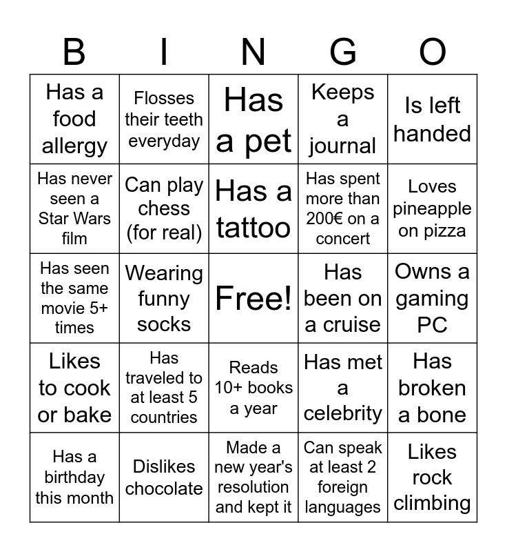This bingo card has a free space and 24 words: Has a birthday this month, Has traveled to at least 5 countries, Has a tattoo, Can speak at least 2 foreign languages, Is left handed, Has a food allergy, Flosses their teeth everyday, Has a pet, Has been on a cruise, Owns a gaming PC, Has seen the same movie 5+ times, Can play chess (for real), Has met a celebrity, Has broken a bone, Has never seen a Star Wars film, Dislikes chocolate, Made a new year's resolution and kept it, Keeps a journal, Loves pineapple on pizza, Likes to cook or bake, Wearing funny socks, Reads 10+ books a year, Has spent more than 200€ on a concert and Likes rock climbing.