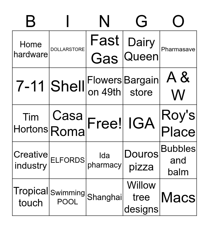 This bingo card has a free space and 24 words: ELFORDS, Swimming POOL, Flowers on 49th, Tropical touch, Pharmasave, Home hardware, 7-11, DOLLARSTORE, IGA, Ida pharmacy, Bargain store, Tim Hortons, Douros pizza, Bubbles and balm, Shell, Willow tree designs, Roy's Place, Fast Gas, A & W, Casa Roma, Macs, Creative industry, Dairy Queen and Shanghai.