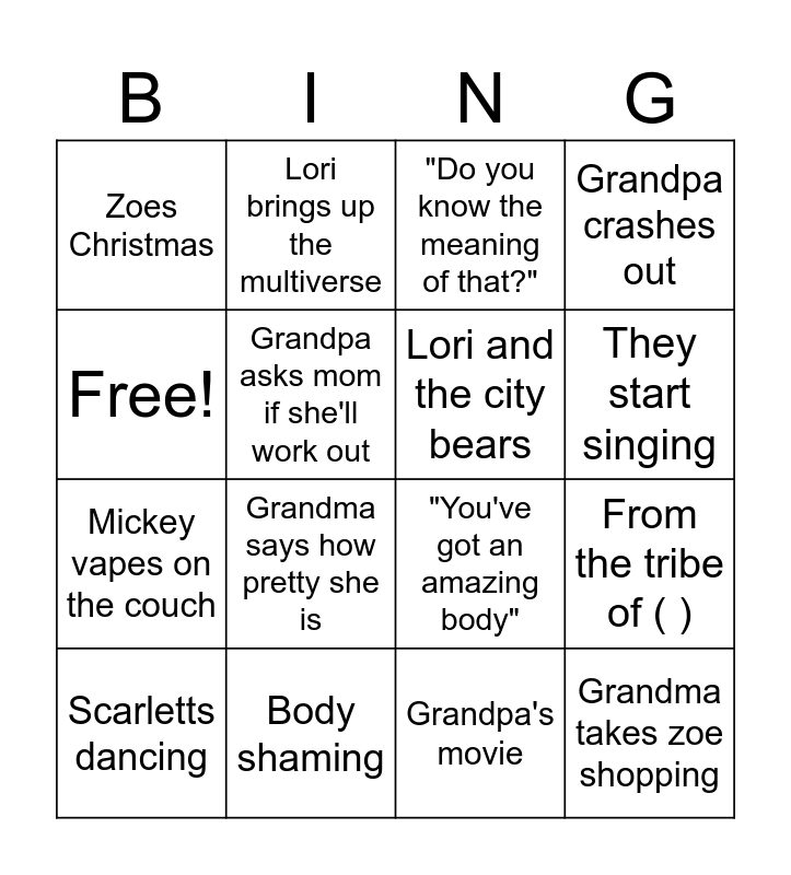 This bingo card has 16 words: Body shaming, From the tribe of ( ), "Do you know the meaning of that?", Zoes Christmas, Mickey vapes on the couch, Lori brings up the multiverse, "You've got an amazing body", Grandpa's movie, Free!, Grandpa asks mom if she'll work out, Scarletts dancing, Grandpa crashes out, Grandma says how pretty she is, They start singing, Lori and the city bears and Grandma takes zoe shopping.