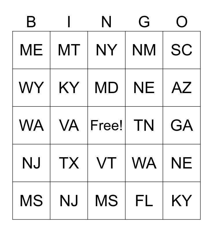 This bingo card has a free space and 49 words: AZ, IN, MO, FL, GA, CA, MT, NV, NE, VT, WY, VA, WA, KY, TX, MD, NY, TN, MI, ME, NJ, MS, NM, SC, WY, TX, MD, NM, NE, NJ, NY, VT, MI, NM, MS, VA, Free!, CA, AZ, TN, ME, IN, NE, MT, WA, KY, WA, MO and SC.