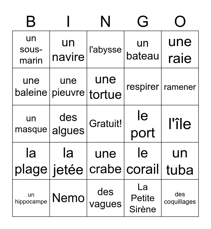 This bingo card has a free space and 39 words: une méduse, un dauphin, un poisson, une pieuvre, un hippocampe, une crabe, une tortue, un requin, une raie, la plage, des algues, un bateau, des coquillages, l'île, le port, la jetée, la pêche, un sous-marin, une étoile de mer, le corail, une baleine, des vagues, respirer, ramener, le pont, renverser, sous-marin/sous-marine, capturer, attraper, un navire, profond/profonde, le sable, l'abysse, Nemo, La Petite Sirène, la plongée sous-marine, un tuba, un masque and une combinaison de plongée.