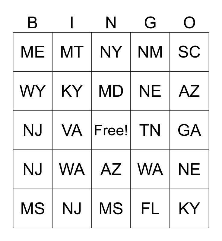 This bingo card has a free space and 49 words: AZ, IN, MO, FL, GA, CA, MT, NV, NE, VT, WY, VA, WA, KY, TX, MD, NY, TN, MI, ME, NJ, MS, NM, SC, WY, WA, MD, NM, NE, NJ, NY, AZ, MI, TX, MS, VA, Free!, CA, AZ, TN, ME, IN, NE, MT, NJ, KY, WA, MO and SC.