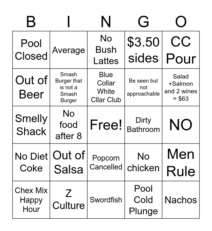This bingo card has a free space and 24 words: Out of Salsa, Z Culture, Blue Collar White Cllar Club, Chex Mix Happy Hour, CC Pour, Pool Closed, Out of Beer, Average, Dirty Bathroom, Popcorn Cancelled, Be seen but not approachable, Smelly Shack, No chicken, Men Rule, Smash Burger that is not a Smash Burger, Pool Cold Plunge, NO, No Bush Lattes, Salad +Salmon and 2 wines = $63, No food after 8, Nachos, No Diet Coke, $3.50 sides and Swordfish.