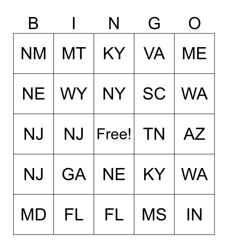 This bingo card has a free space and 49 words: AZ, IN, MO, FL, GA, CA, MT, NV, NE, VT, WY, VA, WA, KY, TX, MD, NY, TN, MI, ME, NJ, MS, NM, SC, WY, WA, MD, MS, NE, NJ, NY, AZ, MI, TX, FL, VA, Free!, CA, AZ, TN, ME, IN, NE, MT, NJ, KY, WA, MO and SC.