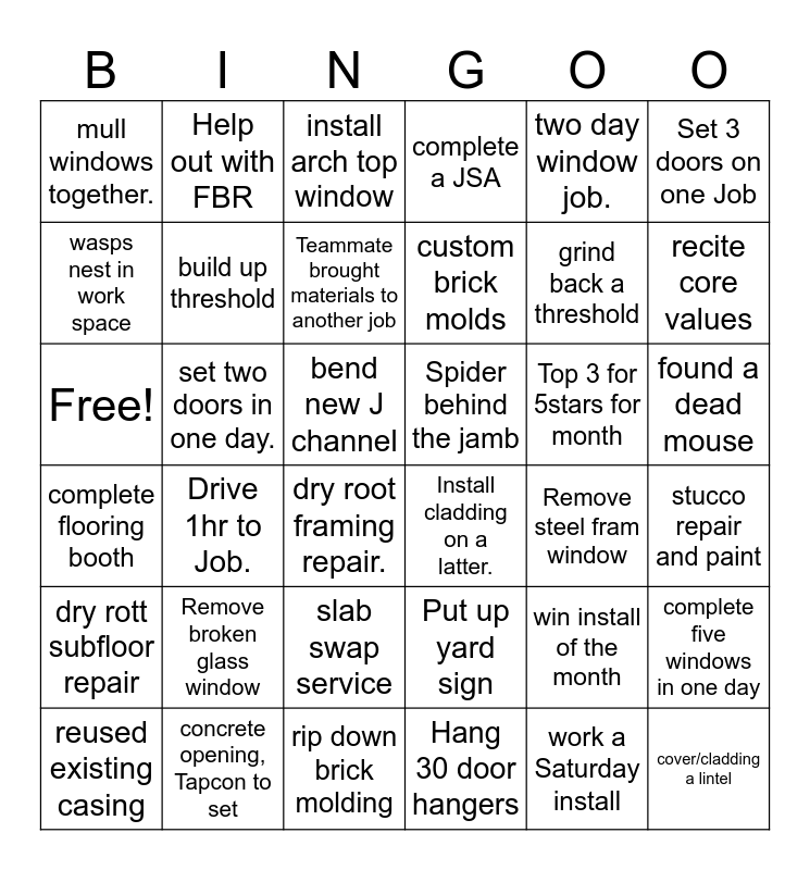 This bingo card has 36 words: Put up yard sign, slab swap service, Hang 30 door hangers, wasps nest in work space, complete flooring booth, Spider behind the jamb, build up threshold, rip down brick molding, two day window job., win install of the month, recite core values, complete a JSA, complete five windows in one day, set two doors in one day., custom brick molds, mull windows together., dry rott subfloor repair, Top 3 for 5stars for month, Free!, install arch top window, bend new J channel, Drive 1hr to Job., Install cladding on a latter., dry root framing repair., Remove steel fram window, Help out with FBR, grind back a threshold, concrete opening, Tapcon to set, Teammate brought materials to another job, Set 3 doors on one Job, cover/cladding a lintel, reused existing casing, stucco repair and paint, found a dead mouse, Remove broken glass window and work a Saturday install.