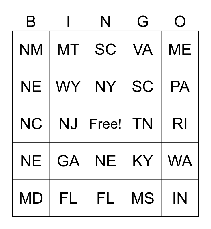 ⚠ This card has duplicate items: IN (2), FL (2), CA (2), MT (2), NE (3), WY (2), VA (2), KY (2), MD (2), NY (2), TN (2), MS (2), SC (2)