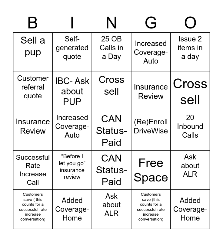 This bingo card has 25 words: “Before I let you go” insurance review, Ask about ALR, Cross sell, Customers save ( this counts for a successful rate increase conversation), Issue 2 items in a day, Sell a pup, Customer referral quote, Self-generated quote, (Re)Enroll DriveWise, CAN Status- Paid, Insurance Review, Insurance Review, Free Space, Ask about ALR, IBC- Ask about PUP, Added Coverage- Home, 20 Inbound Calls, 25 OB Calls in a Day, Cross sell, Increased Coverage- Auto, CAN Status- Paid, Added Coverage- Home, Successful Rate Increase Call, Increased Coverage- Auto and Customers save (this counts for a successful rate increase conversation).