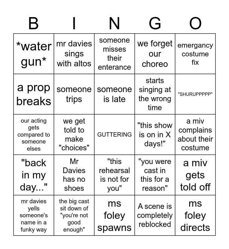 This bingo card has a free space and 24 words: Mr Davies has no shoes, the big cast sit down of "you're not good enough", someone is late, mr davies yells someone's name in a funky way, emergancy costume fix, *water gun*, a prop breaks, mr davies sings with altos, "this show is on in X days!", "this rehearsal is not for you", starts singing at the wrong time, our acting gets compared to someone elses, "you were cast in this for a reason", a miv gets told off, someone trips, A scene is completely reblocked, a miv complains about their costume, someone misses their enterance, "SHURUPPPPP", we get told to make "choices", ms foley directs, "back in my day...", we forget our choreo and ms foley spawns.