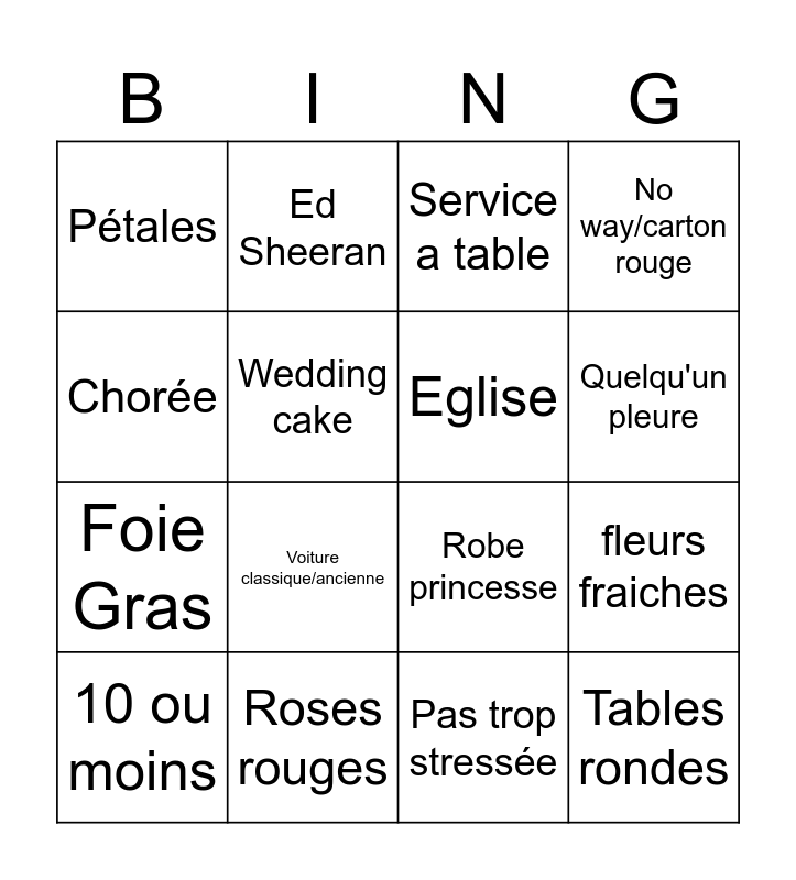This bingo card has 16 words: Roses rouges, fleurs fraiches, Service a table, Pétales, Foie Gras, Ed Sheeran, Robe princesse, Pas trop stressée, Chorée, Wedding cake, 10 ou moins, No way/carton rouge, Voiture classique/ancienne, Quelqu'un pleure, Eglise and Tables rondes.
