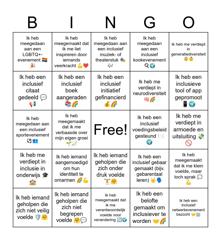 This bingo card has a free space and 25 words: Ik heb iemand aangemoedigd om hun identiteit te omarmen ππͺ, Ik heb meegemaakt dat ik me verantwoordelijk voelde voor verandering ππ, Ik heb een inclusief initiatief gefinancierd π°π, Ik heb iemand geholpen die zich niet veilig voelde π‘οΈπ€, Ik heb me verdiept in generatiediversiteit π΅πΆ, Ik heb meegedaan aan een LGBTQ+-evenement π³οΈβππ, Ik heb een inclusief citaat gedeeld π¬π’, Ik heb meegemaakt dat ik me liet inspireren door iemands veerkracht πͺβ€οΈ, Ik heb een inclusief voedingsbeleid gesteund π½οΈπ, Ik heb iemand geholpen die zich onder druk voelde ποΈπ€, Ik heb me verdiept in neurodiversiteit π§ π, Ik heb meegedaan aan een inclusief sportevenement β½π₯, Ik heb een inclusief gebaar gemaakt (bijv. gebarentaal leren) π€π£οΈ, Ik heb meegemaakt dat ik me klein voelde, maar toch sprak π―οΈπͺ, Ik heb een inclusief boek aangeraden ππ, Ik heb iemand geholpen die zich eenzaam voelde π€π, Ik heb me verdiept in armoede en uitsluiting πΈπ«, Ik heb meegedaan aan een inclusief muziek- of theaterstuk ππΆ, Ik heb een inclusieve tool of app gepromoot π±π, Ik heb meegemaakt dat ik me verbaasde over mijn eigen groei π±π, Ik heb een inclusief netwerkevenement bezocht π€π’, Ik heb iemand geholpen die zich niet begrepen voelde π€π¬, Ik heb me verdiept in inclusie in onderwijs ππ«, Ik heb meegedaan aan een inclusief kookevenement π³π and Ik heb een belofte gemaakt om inclusiever te worden π€π.