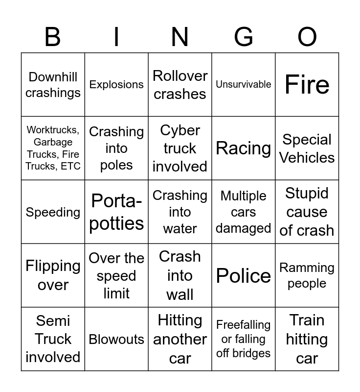 This bingo card has 25 words: Over the speed limit, Hitting another car, Cyber truck involved, Semi Truck involved, Fire, Downhill crashings, Worktrucks, Garbage Trucks, Fire Trucks, ETC, Explosions, Multiple cars damaged, Crash into wall, Racing, Speeding, Police, Ramming people, Crashing into poles, Train hitting car, Stupid cause of crash, Rollover crashes, Special Vehicles, Porta-potties, Crashing into water, Blowouts, Flipping over, Unsurvivable and Freefalling or falling off bridges.