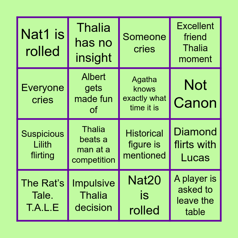 This bingo card has 34 words: Someone new joins the Wardens, Diamond flirts with Harold, Oh yeah!Our missing fathers (dads become relevant again), No rain in London, A player is asked to leave the table, Agatha knows exactly what time it is, Everyone cries, Oliver mention!, Thalia has no insight, Rosalind has an above 20 persuasion roll, Not Canon, Someone cries, Everyone cries, “We’ll edit this out later”, Impulsive Thalia decision, Thalia beats a man at a competition, New props to match the story, Historical figure is mentioned, “You think its ____”, “Oh Goodness!”, Silent observer Agatha moment, People said cool back then, Nat1 is rolled, Nat20 is rolled, Very Dramatic Letters, The Rat’s Tale. T.A.L.E, Excellent friend Thalia moment, Cool magic item acquired ✔️, Suspicious Lilith flirting, Albert gets made fun of, Evil tarot card appearance, Diamond flirts with Lucas, Lucas swoons and Harold MVP.
