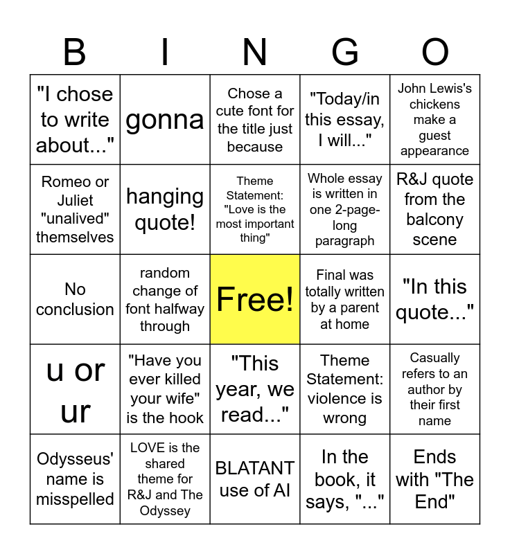 This bingo card has a free space and 25 words: "Have you ever killed your wife" is the hook, BLATANT use of AI, Theme Statement: "Love is the most important thing", Odysseus' name is misspelled, John Lewis's chickens make a guest appearance, "I chose to write about...", Romeo or Juliet "unalived" themselves, gonna, Final was totally written by a parent at home, "This year, we read...", Whole essay is written in one 2-page-long paragraph, No conclusion, Theme Statement: violence is wrong, Casually refers to an author by their first name, hanging quote!, Calls the narrator of the Black Cat "the guy", "In this quote...", Chose a cute font for the title just because, R&J quote from the balcony scene, random change of font halfway through, Ends with "The End", LOVE is the shared theme for R&J and The Odyssey, u or ur, "Today/in this essay, I will..." and In the book, it says, "...".