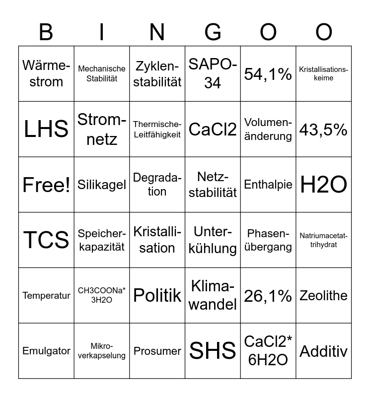 This bingo card has 36 words: Klima- wandel, Politik, SHS, LHS, TCS, Netz- stabilität, Strom- netz, Prosumer, 54,1%, 26,1%, 43,5%, SAPO-34, Zeolithe, Silikagel, CaCl2, Wärme- strom, Temperatur, Enthalpie, Free!, Zyklen- stabilität, Degrada- tion, Speicher- kapazität, Unter- kühlung, Kristalli- sation, Phasen- übergang, Mechanische Stabilität, Volumen- änderung, Mikro- verkapselung, Thermische- Leitfähigkeit, Kristallisations- keime, Additiv, Emulgator, Natriumacetat- trihydrat, H2O, CH3COONa* 3H2O and CaCl2* 6H2O.