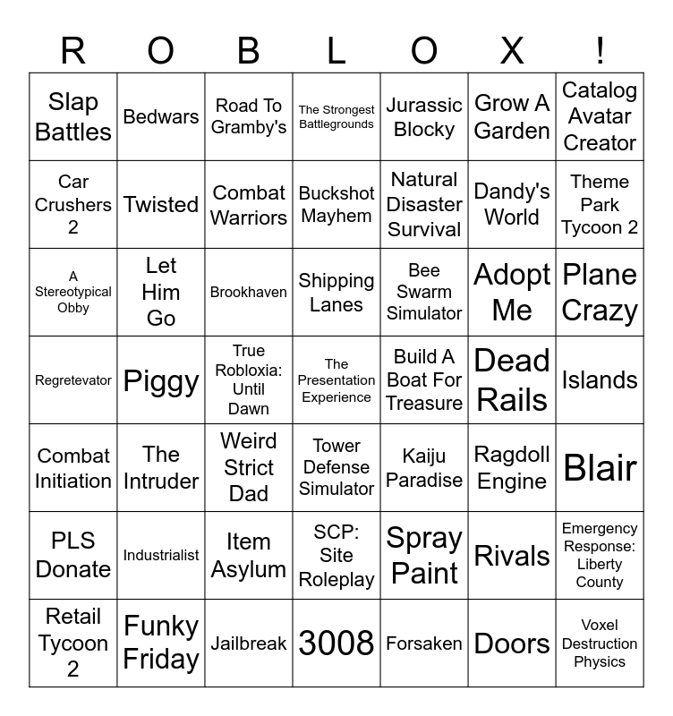 This bingo card has 49 words: Rivals, Dandy's World, Forsaken, Piggy, Brookhaven, Islands, Bedwars, Jailbreak, Grow A Garden, Tower Defense Simulator, Catalog Avatar Creator, The Strongest Battlegrounds, Adopt Me, Bee Swarm Simulator, Industrialist, Dead Rails, Car Crushers 2, Theme Park Tycoon 2, Emergency Response: Liberty County, Jurassic Blocky, Natural Disaster Survival, True Robloxia: Until Dawn, Slap Battles, Twisted, Retail Tycoon 2, Combat Warriors, Plane Crazy, Funky Friday, Shipping Lanes, Let Him Go, Voxel Destruction Physics, Build A Boat For Treasure, PLS Donate, Item Asylum, Regretevator, Kaiju Paradise, Ragdoll Engine, Blair, A Stereotypical Obby, Weird Strict Dad, SCP: Site Roleplay, Combat Initiation, The Presentation Experience, 3008, Buckshot Mayhem, Road To Gramby's, Spray Paint, The Intruder and Doors.
