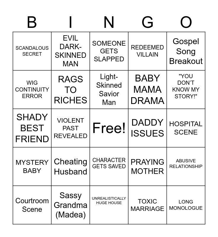 This bingo card has a free space and 24 words: Cheating Husband, Sassy Grandma (Madea), Light-Skinned Savior Man, Courtroom Scene, Gospel Song Breakout, SCANDALOUS SECRET, WIG CONTINUITY ERROR, EVIL DARK-SKINNED MAN, DADDY ISSUES, CHARACTER GETS SAVED, BABY MAMA DRAMA, SHADY BEST FRIEND, PRAYING MOTHER, ABUSIVE RELATIONSHIP, RAGS TO RICHES, TOXIC MARRIAGE, HOSPITAL SCENE, SOMEONE GETS SLAPPED, "YOU DON’T KNOW MY STORY!", VIOLENT PAST REVEALED, LONG MONOLOGUE, MYSTERY BABY, REDEEMED VILLAIN and UNREALISTICALLY HUGE HOUSE.