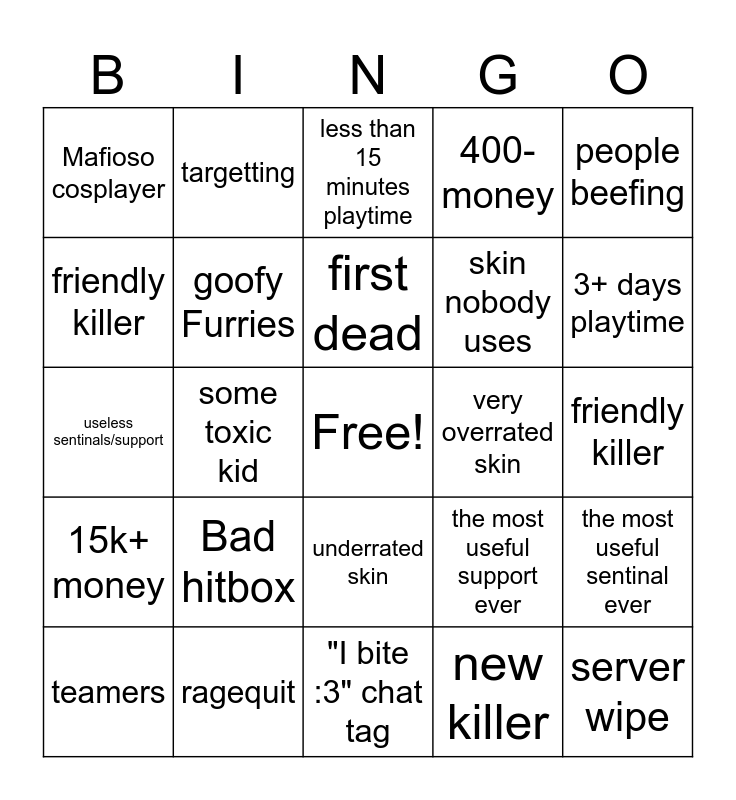This bingo card has a free space and 24 words: Bad hitbox, ragequit, first dead, teamers, people beefing, Mafioso cosplayer, friendly killer, targetting, very overrated skin, underrated skin, skin nobody uses, useless sentinals/support, the most useful support ever, the most useful sentinal ever, goofy Furries, new killer, friendly killer, less than 15 minutes playtime, 3+ days playtime, some toxic kid, server wipe, 15k+ money, 400- money and "I bite :3" chat tag.