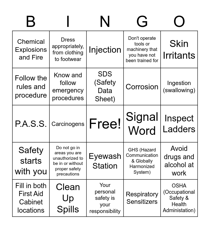 This bingo card has a free space and 50 words: Safety, OSHA (Occupational Safety & Health Administation), Preventing workplace incidents is everyone’s job, Your personal safety is your responsibility, Do not go in areas you are unauthorized to be in or without proper safety precautions, Avoid distractions or distracting others, Dress appropriately, from clothing to footwear, Keep work areas neat and tidy., Follow the rules and procedure, Report accidents or safety hazards to the department manager or management, Know and follow emergency procedures, Don't operate tools or machinery that you have not been trained for, Avoid drugs and alcohol at work, GHS (Hazard Communication & Globally Harmonized System), Hazrd Signs & Labels, Product Identifier, SDS (Safety Data Sheet), Signal Word, Pictograms, Skin Irritants, Carcinogens, Respiratory Sensitizers, Chemical Explosions and Fire, Corrosion, Chemical Reactions, Inhalation (breathing), Ingestion (swallowing), Contact with skin and eyes, Injection, Eyewash Station, Safety Wall, Fill In One First Aid/AED Certified Employee, Don’t Be In A Hurry, Pay Attention To Your Step, Clean Up Spills, Practice Walking Safely, Use Nonskid Shoes And Surfaces When Available, Maintain Proper Lighting, Exercise Stair Safety, Inspect Ladders, Choose the Right Ladder, Set Up Ladder Properly, Climb Safely, Mark if you demonstrate a proper lift, Fill in both First Aid Cabinet locations, P.A.S.S., Fire Safety, Know where the closest exit is in your area, Safety starts with you and Pay attention to your surroundings and those around you.