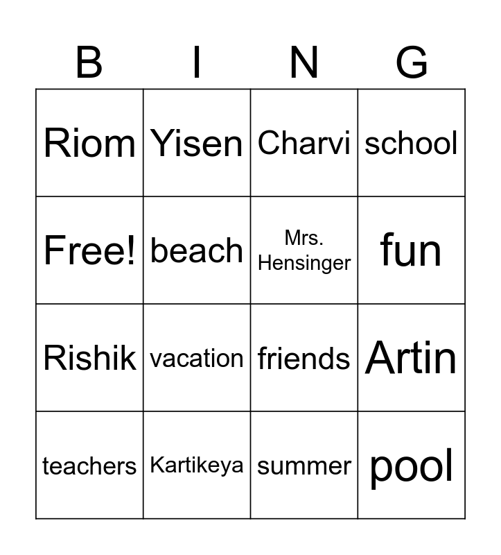 This bingo card has 16 words: Kartikeya, Artin, Charvi, Riom, Rishik, Yisen, friends, summer, Free!, beach, teachers, school, vacation, fun, Mrs. Hensinger and pool.
