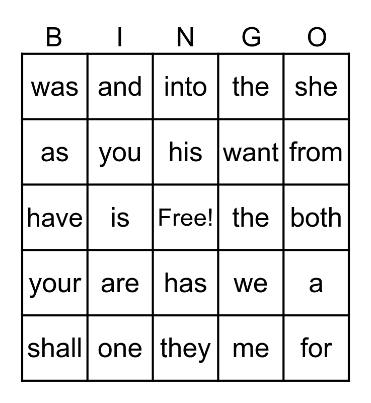 This bingo card has a free space and 29 words: shall, does, is, do, was, into, you, are, the, one, both, for, they, me, from, he, has, your, she, have, we, or, want, as, the, and, a, his and be.