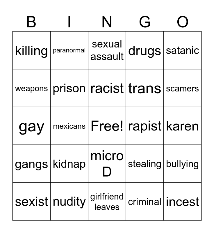 This bingo card has a free space and 24 words: kidnap, nudity, racist, sexist, satanic, killing, weapons, paranormal, rapist, micro D, trans, gay, stealing, bullying, prison, criminal, karen, sexual assault, scamers, mexicans, incest, gangs, drugs and girlfriend leaves.
