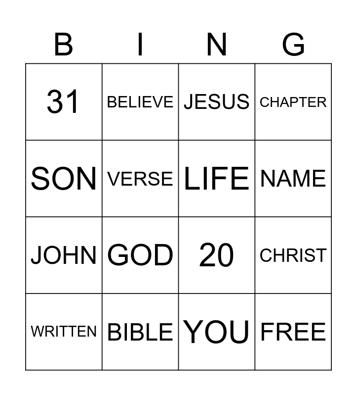 This bingo card has 17 words: Free!, WRITTEN, BELIEVE, JESUS, CHRIST, SON, GOD, LIFE, NAME, JOHN, BIBLE, 20, CHAPTER, 31, VERSE, YOU and FREE.