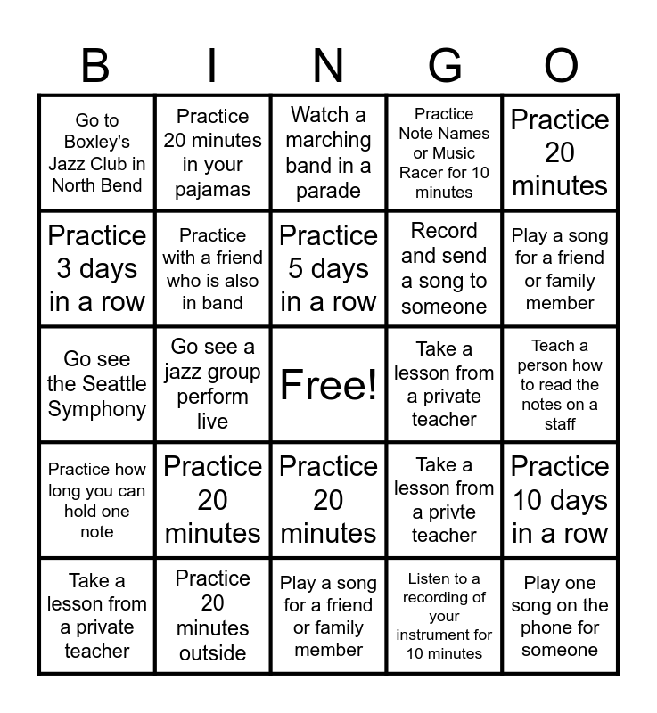 This bingo card has a free space and 24 words: Practice 20 minutes, Practice 20 minutes outside, Practice 5 days in a row, Take a lesson from a private teacher, Practice 20 minutes, Go to Boxley's Jazz Club in North Bend, Practice 3 days in a row, Practice 20 minutes in your pajamas, Take a lesson from a private teacher, Practice 20 minutes, Record and send a song to someone, Go see the Seattle Symphony, Take a lesson from a privte teacher, Practice 10 days in a row, Practice with a friend who is also in band, Listen to a recording of your instrument for 10 minutes, Teach a person how to read the notes on a staff, Watch a marching band in a parade, Play a song for a friend or family member, Go see a jazz group perform live, Play one song on the phone for someone, Practice how long you can hold one note, Practice Note Names or Music Racer for 10 minutes and Play a song for a friend or family member.