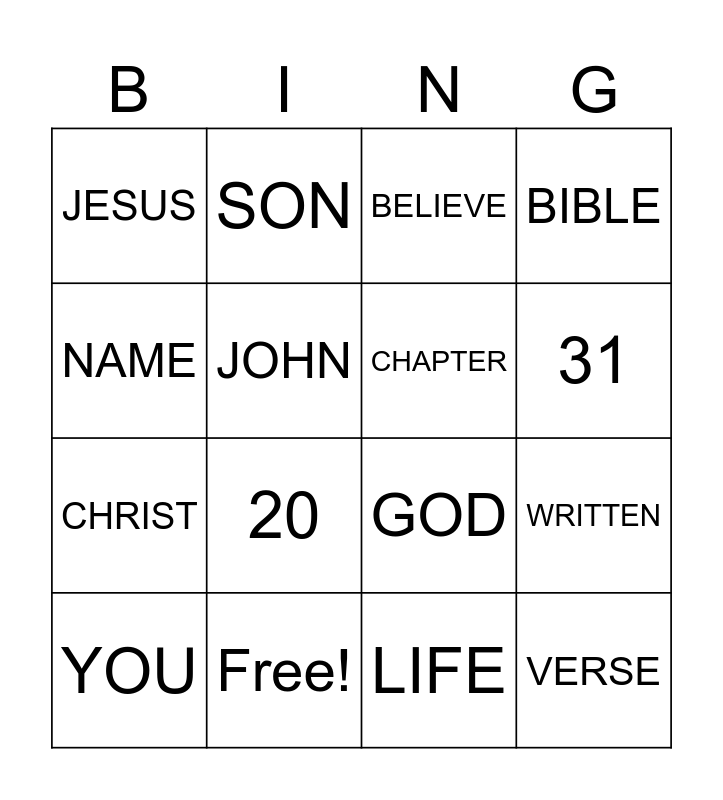 This bingo card has 16 words: Free!, WRITTEN, BELIEVE, JESUS, CHRIST, SON, GOD, LIFE, NAME, JOHN, YOU, BIBLE, 20, 31, CHAPTER and VERSE.