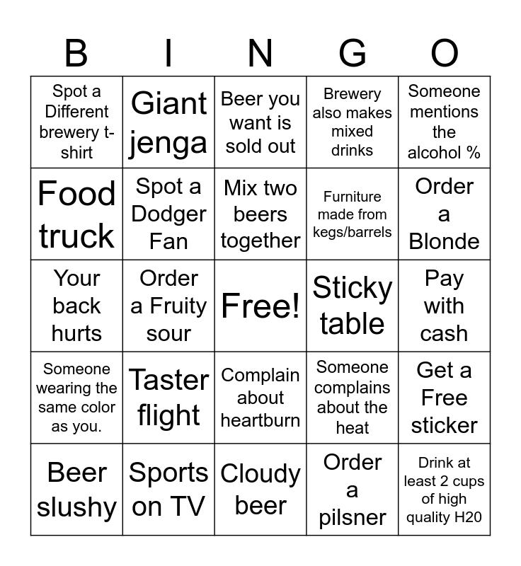 This bingo card has a free space and 53 words: Awards on the wall, Drink at least 2 cups of high quality H20, Order a different drink than your last, Order a pilsner, Taster flight, Order a stout, Giant jenga, Exposed brick, Food truck, Someone says "Too hoppy", Spot a Dodger Fan, Someone says “Try this”, Get a Free sticker, Someone complains about the heat, Order an Ale, Beer slushy, Mix two beers together, Sticky table, Order a cerveza, Someone mentions the alcohol %, Order a Fruity sour, Bartender isn’t a dude, Furniture made from kegs/barrels, Spot a Different brewery t-shirt, Cute dog, Sports on TV, Quirky bathroom signs, Someone guesses time badly, Hear someone say “my drink is too hot”, Order a Blonde, Your knees crack, Twinkle lights, Beer with riske name, Too much head, Win a game, Order a DIPA, Brewery also makes mixed drinks, Cloudy beer, Beer you want is sold out, Cheers, Character on a logo, Beer stein in brewery logo, Pay with cash, Buy a round, Order a spicy beer, Complain about heartburn, Order an Ale, Misplace something, but find it, Your back hurts, Someone wearing the same color as you., Someone has their dogs out, You liked your drink and You didn’t like your drink..