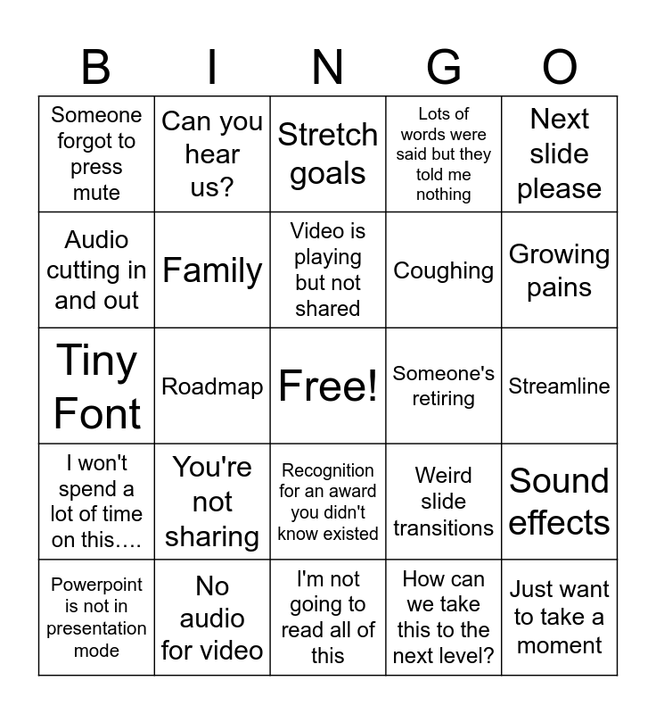 This bingo card has a free space and 24 words: You're not sharing, No audio for video, Video is playing but not shared, Powerpoint is not in presentation mode, Next slide please, Someone forgot to press mute, Audio cutting in and out, Can you hear us?, Someone's retiring, Recognition for an award you didn't know existed, Coughing, Tiny Font, Weird slide transitions, Sound effects, Family, How can we take this to the next level?, Streamline, Stretch goals, Growing pains, Roadmap, Just want to take a moment, I won't spend a lot of time on this…., Lots of words were said but they told me nothing and I'm not going to read all of this.