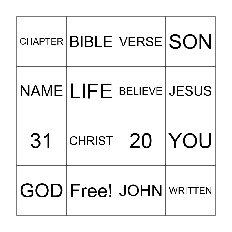 This bingo card has 16 words: Free!, YOU, VERSE, CHAPTER, 31, BIBLE, 20, JOHN, NAME, LIFE, GOD, SON, CHRIST, JESUS, BELIEVE and WRITTEN.