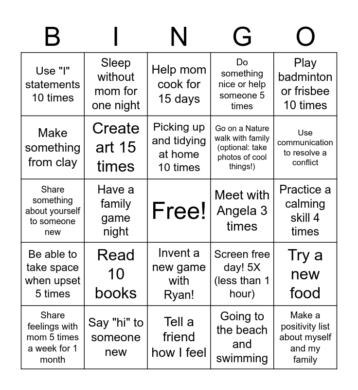This bingo card has a free space and 24 words: Share feelings with mom 5 times a week for 1 month, Read 10 books, Picking up and tidying at home 10 times, Going to the beach and swimming, Play badminton or frisbee 10 times, Use "I" statements 10 times, Sleep without mom for one night, Help mom cook for 15 days, Meet with Angela 3 times, Practice a calming skill 4 times, Share something about yourself to someone new, Create art 15 times, Screen free day! 5X (less than 1 hour), Try a new food, Make something from clay, Say "hi" to someone new, Tell a friend how I feel, Do something nice or help someone 5 times, Use communication to resolve a conflict, Be able to take space when upset 5 times, Have a family game night, Invent a new game with Ryan!, Go on a Nature walk with family (optional: take photos of cool things!) and Make a positivity list about myself and my family.